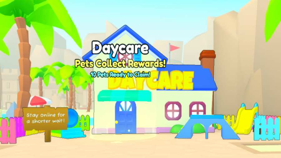 To put it simply, the Daycare in Pet Simulator 99 works exactly the same as the Daycare in Pet Simulator X, and is a way for you to earn passive income and items while you're out of the experience—it doesn't increase the value of your pets, or raise their level/damage, despite what you may have been told by other players. The Daycare in PS99 is located in the Beach area, or Area #20.