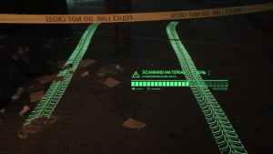 Scan her arms to find she has a green substance, her head to reveal she was hit with a blunt object, and finally, her feet to reveal scuff marks. After examining the deceased woman, move to find the following clues: a pool of blood and tire tracks.