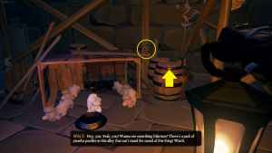 Your task is to help the Chef make the stew. Use the kitchen key to head outside and catch a red herring, then add that and the ingredients in the kitchen to the stew. Before leaving the Scum Bar, there are two things you need to do—collect the meat and give the patrons grog.
