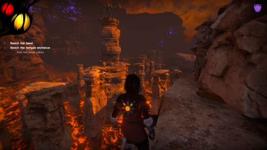 After you have activated the first Seed of Life, you must go on another journey to activate some others. The game's second area is a lava canyon area, where lava and heat will kill you faster than the darkness of the previous area. You'll eventually get to an area where you have to jump over stone pillars, which sounds simple.