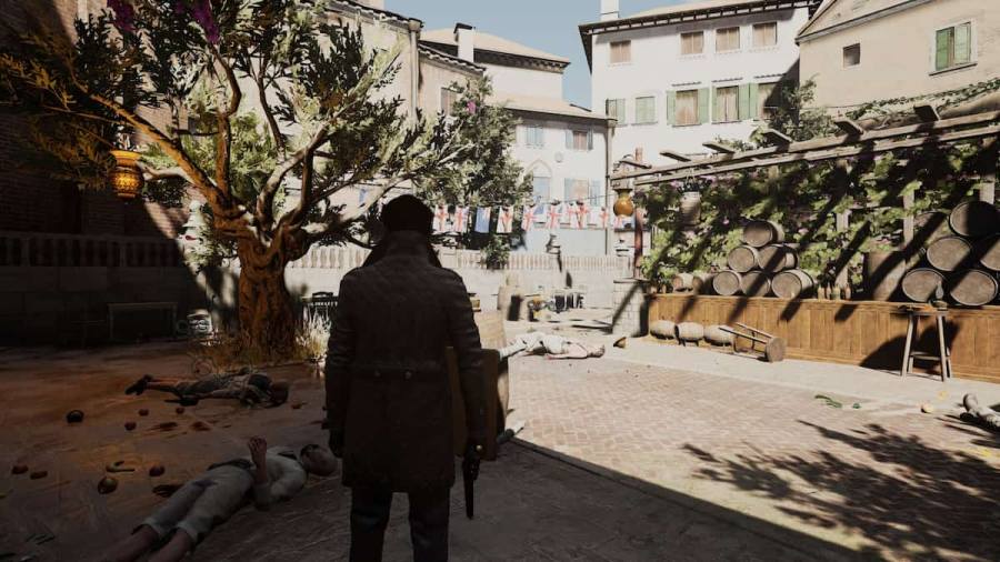 Now follow the sounds of destruction through the door and into the outdoor tavern, where you'll have to fight three waves of enemies. There are a ton of shootable objects in the environment—use them to your advantage and dispatch the sailors as you see fit. After the fight, you can find the violin on a stool in the center of the area.