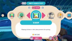 Since chicken is food for various slimes, it's best to farm these inside The Conservatory so that you can utilize them more efficiently. In the open, chickens will get eaten by wild slimes, but you can keep them safe by placing them inside a Coop. A Coop can be built for 250 coins in an empty ranch plot. For the chickens to reproduce, you need at least one Hen Hen and a Roostro.