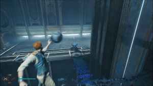 At the second platform, place the orb on the conduit there. Use the lever to switch the bridge and quickly run across before it disappears. But grab the orb to your right below before crossing the bridge completely. Place it in the conduit. Jump to the next platform. Run up the wall and then jump to the next level, placing you on the third floor. Go to your left and use the Force to pull the orb below you.