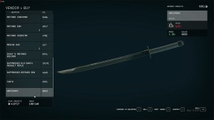 Follow Andrea up the stairs and she'll lead you Briggs. Tell him you want to join the gang and he'll assign you The Audition quest. In the same room, you'll find Hatchet. This is the person from whom you can purchase the Wakizashi Katana, but only after you've completed The Audition mission. Just bring Briggs a slate from a warehouse to complete this quest. After that, you'll be able to talk and trade with Hatchet. Ask her what she has for sale and scroll to the bottom of the weapons list. From there, buy the Wakizashi melee weapon (49 physical damage and 1.35 mass value) for 5833 credits.