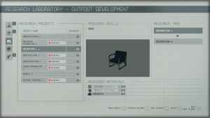 Outpost furniture can be expanded with the Research Desk, which is used to craft various items, (including Outpost items) which you place in your various Outposts. Note decorations for your Outpost are broken into Decoration 1 and Decoration 2 trees. Customizing your Outpost is crucial to get the maximum benefits from it, but also for expressing yourself.