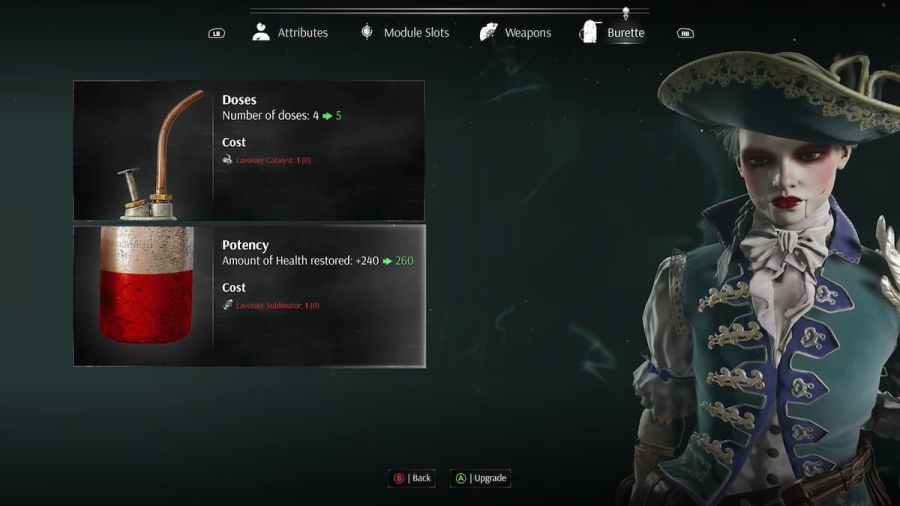 Once you have found a Lavoisier Catalyst or Lavoisier Sublimator, you can infuse it into your Oil Burette at a Vestal. Select Upgrades and tab across to the Burette menu. Here you will be able to improve either the doses or health restored.