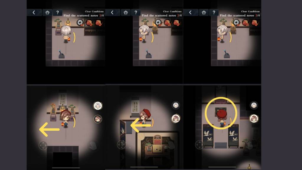 Now we need to switch back to the male lead's side. Since the gate has been opened, head south to find a huge room. Then head to the westernmost part of the room (ignore the furniture, they are not dead ends), where you'll find a small space with Scattered Notes on the ground. Pick them up to proceed.