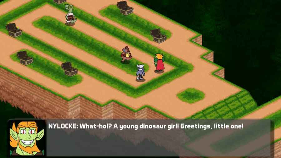 Once you arrive at the secret treasure, you will find two dinosaur players have already claimed the treasure. Challenge them to a fight and if you win, you will receive some of the treasure. One has a natural element while the other uses infernal. After defeating them, go to the furthest left chest and grab the Mysterious Cube hidden.