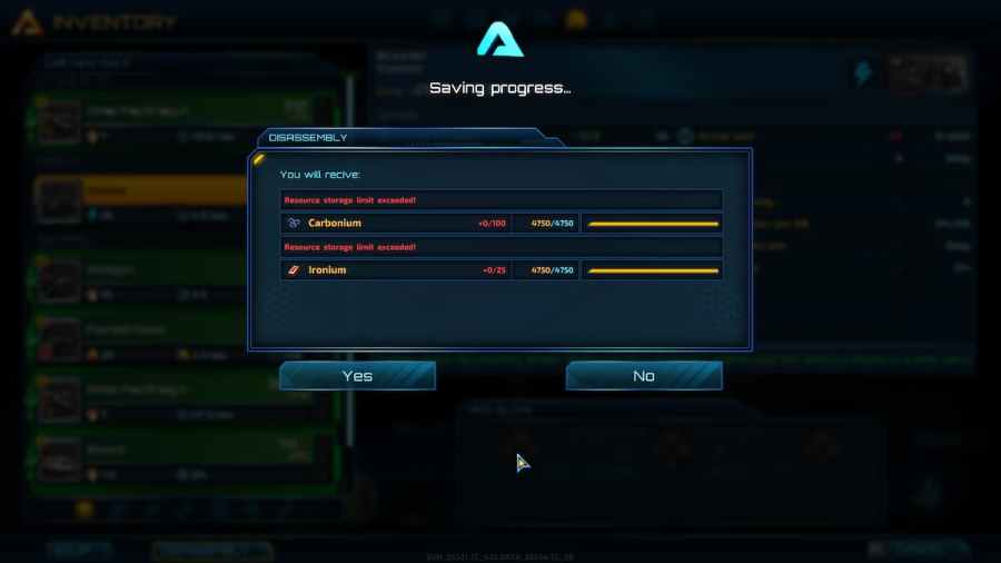This opens a popup that details what resources the player will earn back. This will depend on what is being disassembled. Using this feature clears up inventory space and can give the player much-needed resources at times of need.