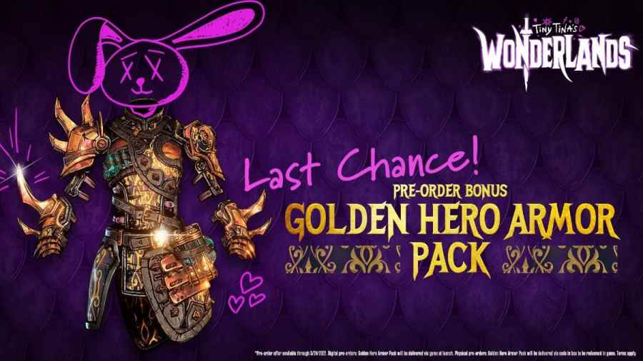 On Monday, March 21, the team at Gearbox let players know they only have a few days left to secure the Golden Hero Armor Pack for Tiny Tina's Wonderlands. This lustrous armor set is exclusive to players who pre-purchase Wonderlands before its launch on March 25.