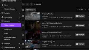 In the Creator Dashboard, you will need to go to Content and select Video Producer to see all Past Broadcasts and Highlights. Selecting Highlight will take you to an editor where you can shorten the previous stream before publishing the VOD permanently. Highlights are stored in the Videos tab when viewing your channel, underneath Past Broadcasts in a section named Recent Highlights and Uploads, or selecting the Filter option when in the Video tab and selecting Highlights. For a more organized system to categorize things, Collections can be made.