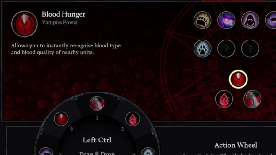 Players are able to feed on creatures' blood to acquire various Blood Types. Each type gives special bonuses to the player and can be difficult to maintain, as vampires will have to drain blood eventually. Hovering the mouse over other creatures displays their blood quality and Blood Type. However, players can unlock the Ability Blood Hunger to always display the blood quality of all nearby creatures. Blood Hunger is unlocked after defeating Tristan the Vampire Hunter.