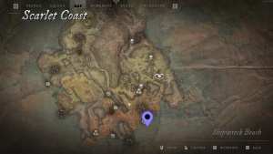 - The second shipwreck is located on the Scarlet Coast, again in the southeastern part of the map. There is a beach that is littered with small boats, and a massive barge further out to sea. To get these to count, you just need to look out over them from the shore; you can't swim so you can't actually get on the boats themselves.