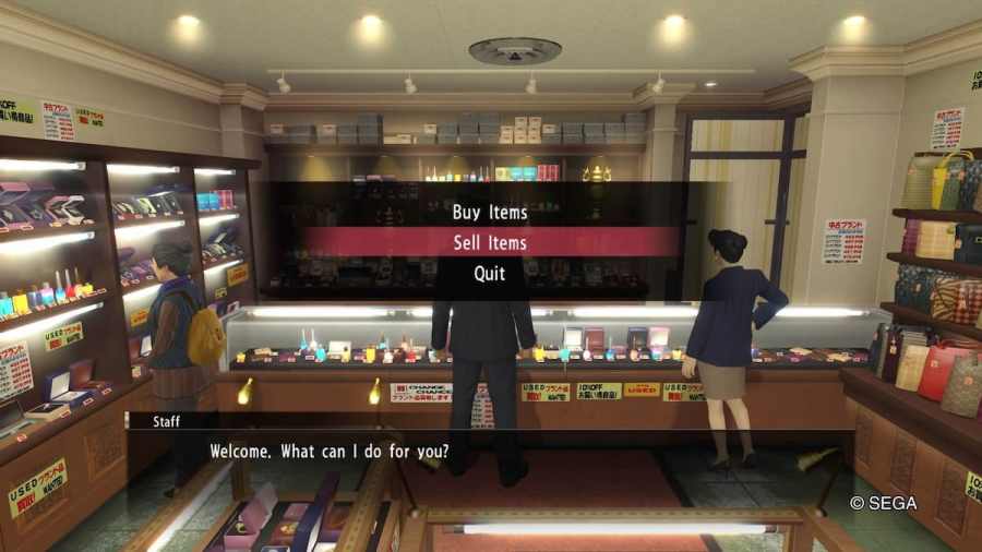 The first pawnshop available is the one in Kamurocho. This is located in Nakamichi Alley by the Mahjong Parlor. Inside, players can talk to the clerk to buy various items and weapons or sell items from their inventory or Item Box.
