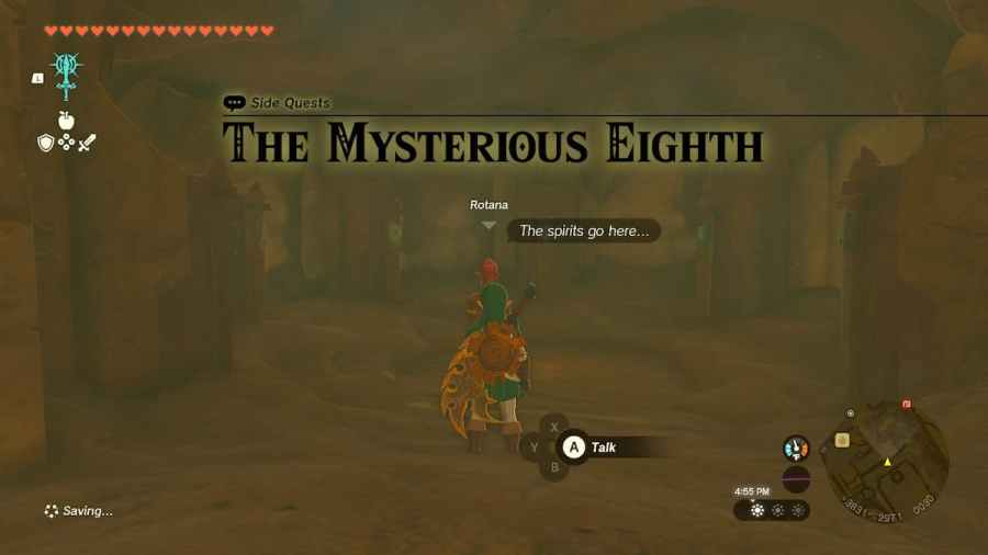 To begin this quest in Tears of the Kingdom, players need to talk to Rotana in the Gerudo Shelter. She won't give the Mysterious Eighth Quest if the player hasn't completed the Stelae quest beforehand, though. Once that is taken are of, Rotana will relocate to the room with the seven statue replicas in the Gerudo Shelter (coordinates: -3833, -2972, 0031)