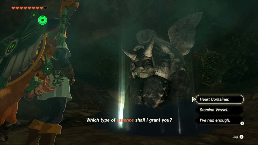 From this point onward, you can talk to the horned statue at any time to trade either a Heart Container or Stamina Vessel for 100 Rupees, converting it into Essence that the statue will hold onto. You can then repurchase the Essence as a Heart Container or Stamina Vessel for 120 Rupees. The total cost is 20 Rupees to swap your hearts and containers, which isn't many Rupees in my experience. You may want to use this statue to increase your stamina to obtain the Master Sword.